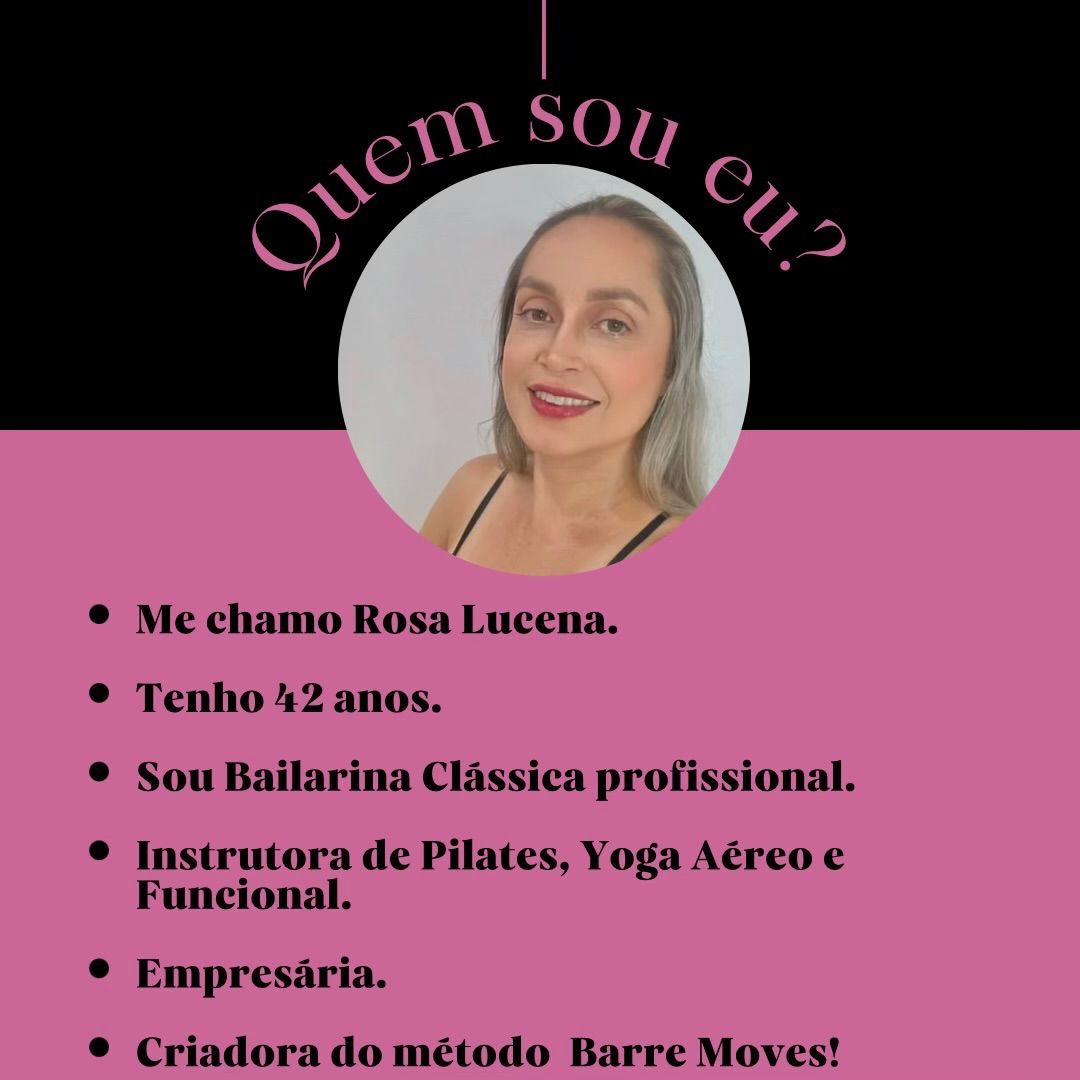 casada e mãe de duas meninas, estou no Clássico desde os três anos de idade e nos últimos dez, decidi desenvolver as habilidades do Pilates, Yoga Aéreo e do Funcional. O processo de aprendizagem sempre era meio frustrante pois nenhum dos cursos entrega o que eu esperava! Foi aí que nasceu o "Método Barre Moves Pilates e Funcional". Eu uni os quase quarenta anos de experiência do Ballet Clássico às outras modalidades e criei um método exclusivo e inovador. Com o meu método, você Profissional do Movimento, poderá dar aulas o ano inteiro sem repetir um treino. As possibilidades são quase infinitas. A garantia de sucesso é imediata! Turmas sempre lotadas e com fila de espera... (Alunas e alunos com semblante de dor, porém, felizes por terem te conhecido e, ao método), é o que eu costumo dizer (: